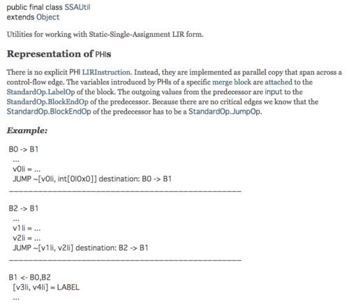 以前SSAそしてPHIとは何かについて学びました。 jyukutyo.hatenablog.com 今回はGraalでのPHIについて調べます。 "static single assignment"で検索すると、org.graalvm.compiler.lir.ssa.SSAUtilクラスを見つけました。 ドキュメンテーションコメントはこう…